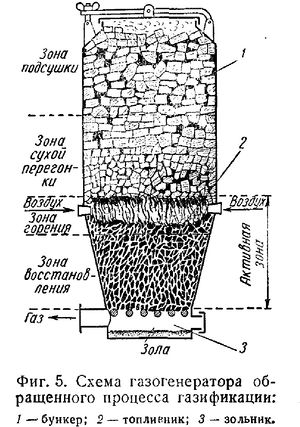 Лучше всего для транспорта подходят газогенераторы обращённого процесса. В генераторах этого типа воздух подавался в среднюю по их высоте часть, в которой и происходил процесс горения. Отбор образовавшихся газов осуществлялся ниже подвода воздуха. Активная зона занимала часть газогенератора от места подвода воздуха до колосниковой решетки, ниже которой был расположен зольник с газоотборным патрубком.
