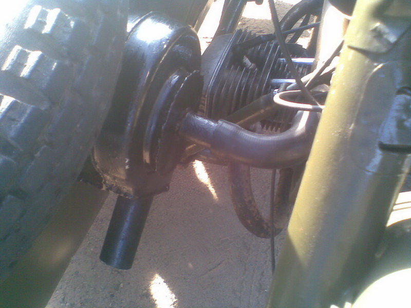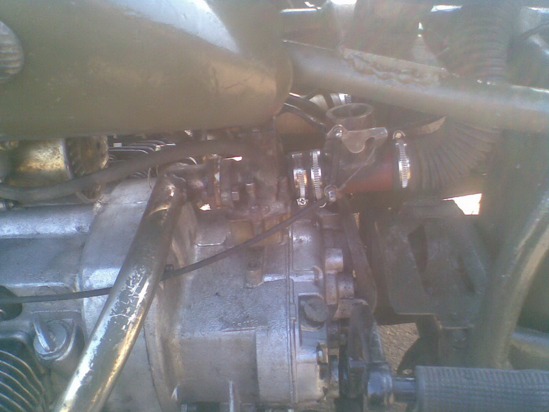 Делаем впускной коллектор под один карбюратор из дужек от кроватей, перед карбюратором ставим смеситель и соединяем его шлангом с распределителем. Для управления воздушной заслонкой в смесителе на руль добавляем рычажок.