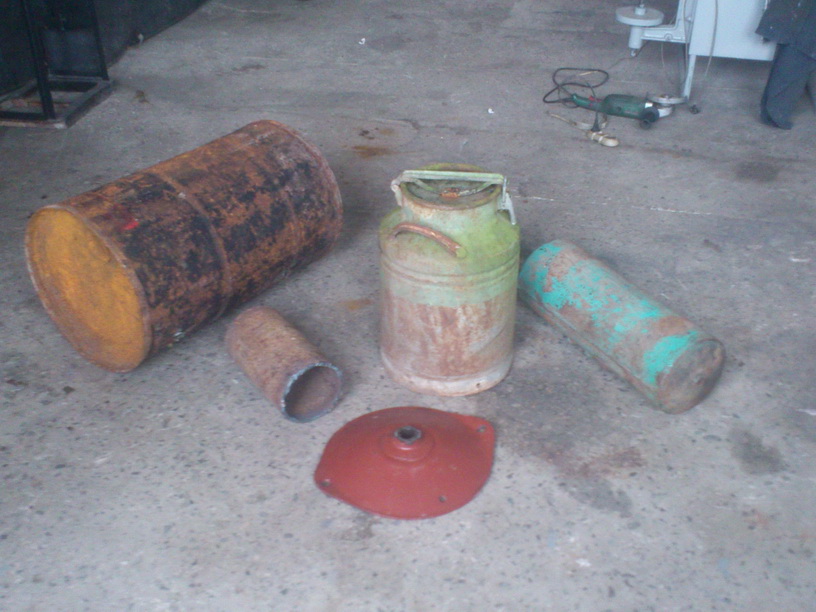 Исходный металлолом: бочка 100л, бидон стальной, диск от роторной косилки, кусок толстостенной трубы диаметром около 160 мм, ресивер, труба со сгоном, шестигранник, чайник из нержавейки, огнетушитель, батарея....