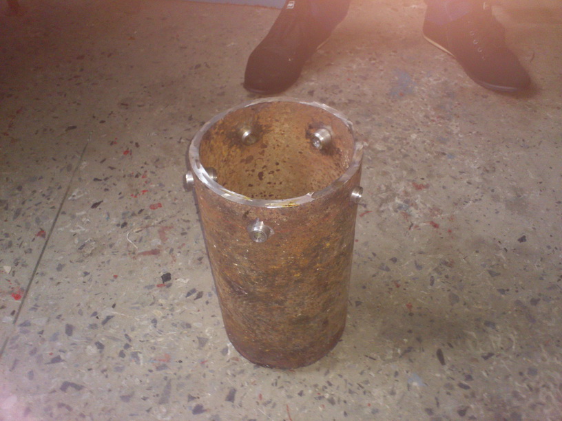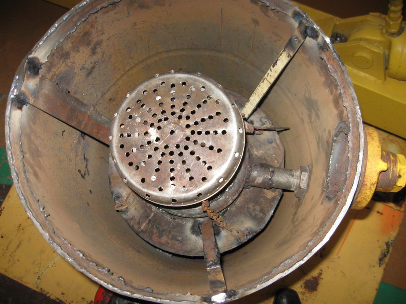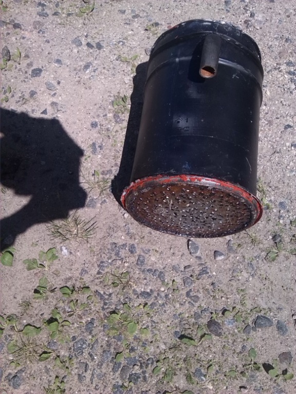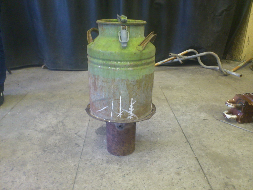 Вставляем бидон с «активной зоной» в бочку, зажав гайками воздухоподводящую трубу, приварив к диску опорные лапы.