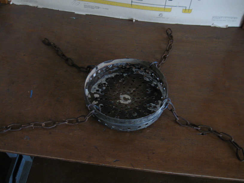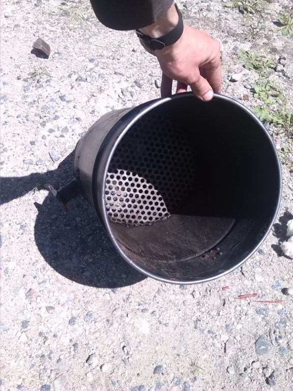 Из старого чайника из нержавёйки делаем колосниковую решётку и для подвижности подвешиваем её на цепях. В крышку бочки ввариваем гайку и вкручиваем в неё болт, который соединён тросом с колосниковой решёткой и позволят встряхивать колосник для очистки.