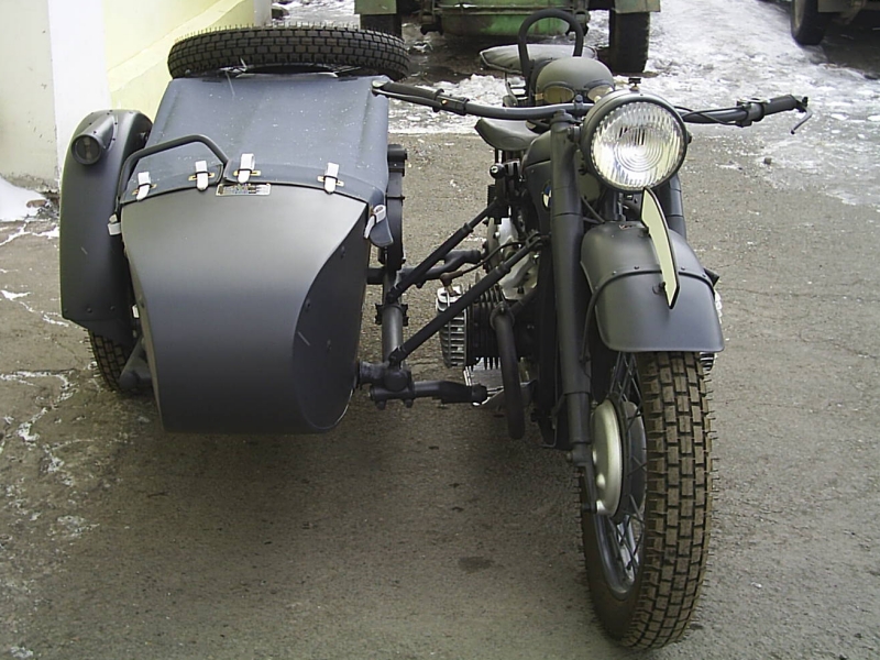 Год выпуска - 1938. Всего их было выпущено 36000 шт.(самый массовый мотоцикл в вермахте). Его можно смело называть "Рабочей лошадкой вермахта". Если R-75 и KS-750 использовали в основном элитные части германской армии, то R-12 был везде и всюду.На них развозили пищу по позициям, на специальных приспособлениях транспортировали в тыл раненых, подвозили медикаменты и выполняли множество других военных работ. Ну и конечно же,в больших количествах использовали в моторизованых частях армии. Мотоцикл славился особой надёжностью и тяговитостью. При его 18 л.с. не перегревался, отлично заводился в любое время года благодаря мощному магнето, выполненому в одном корпусе с генератором(магдино) и наличию устройства подогрева впускного коллектора выхлопными газами. На данной модели мотоцикла, впервые в мире, в 1935 году конструкторы применили телескопическую переднюю вилку.
