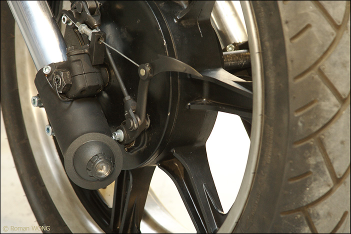 Из того, что было на полках, прорисовалась следующая картина: переднее колесо должно было быть обутым в резину Metzeler размерностью 140/70-18, которую предстояло одеть на алюминиевый сварной из двух ижевских (орионовских) задних колёс обод размером 4.8x18”; на зад замечательно вписалось колесо O.Z.Racing 9x17” от гоночного авто, обутое в резину Bridgestone 245/40-17. Для насыщенности алюминием применили вилку перевернутого типа SHOWA от кроссового мотоцикла и изготовили траверсы из алюминസЊевого сплава. Все алюминиевое отдали на растерзание «наждачке» №40 для обработки в том же стиле, что и двигатель – грубые полосы в одном направлении.