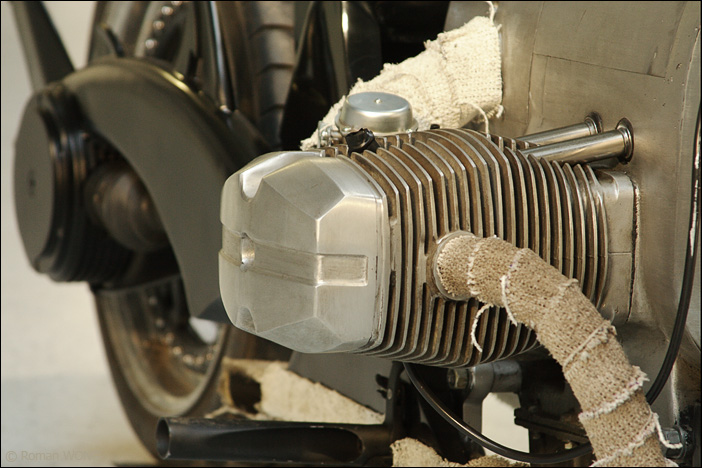 Двигатель представлял собой один большой кусок алюминия - квадратного алюминия, и при полировке он мог превратиться во что-то круглое и зализанное, что сразу нарушило бы весь дизайн. Для того, чтобы придать ещё больше матового оттенка, взяли наждачную бумагу №40 и сделали множество горизонтальных линий на сам агрегат. Для выдержки стиля большая часть деталей должна быть в алюминии, но друг от друга отделена сталью (крашеной сталью) и – НИКАКОГО ХРОМА!