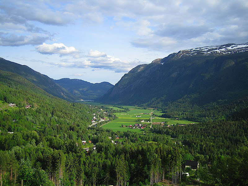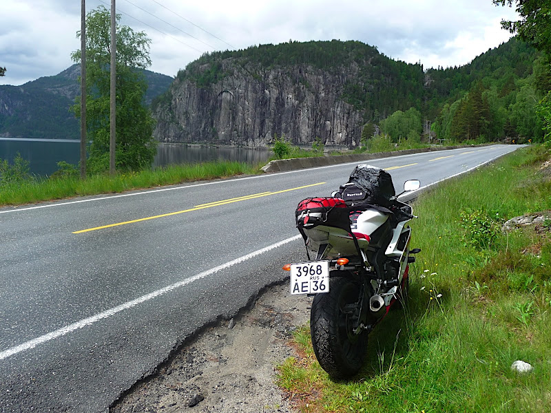 Утро отметилось солнышком и уже традиционной прогулкой по окрестностям кемпинга. Вокруг пирса плавали желтые медузы и баркасик. Коля как раз дочертил пентаграмму и фара заработала. Снова началось улитничество со сборами. Сидя рядом с домиком и наблюдая монотонную картину навьючивания и сборов, я решил таки ударить мотопробегом по разгильдяйству и бездорожью – рвануть через Осло в Германию, а уж оттуда по прямой домой. Коля думал остаться еще на несколько дней и посмотрев на фьорды Бергена проторенной дорожкой вернуться в МКАД. Решили ехать через горы на сервер, а потом на трассе разделиться – Коля на лево, я на право. Дорога через горы была еще более удивительна по видам.