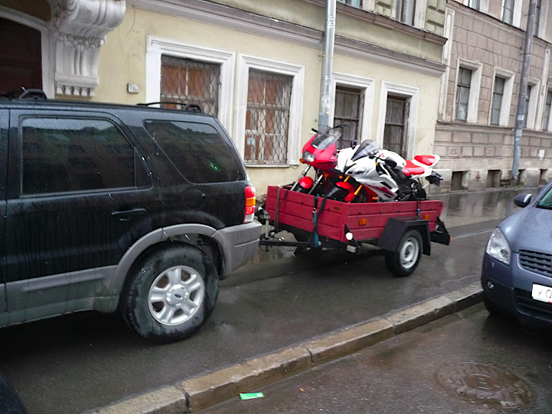 Все могло закончиться так и не начавшись. В среду (3 июня) я с Колей копался с тележкой, джипом и моцыками, а Струков делал вид что нам помогал — катался на моем моцыке — в итоге разбил себе лицо, ну и моцыку досталось — перепрыгнул через бордюр и упал в бетонную канаву глубиной сантиметров 70. Когда подошел и увидел, то подумал, что поездочка собственно говоря не то чтобы откладывается, а как говорил Зелибаба «пора отсюда делать ноги вензелями». Когда достали моц из канавы выяснилось, что вилка цела, мотор и электроника в порядке, даже колеса целы — в убыток ушел пластик и лапка заднего тормоза — слайдеры отработали на все 200%. Со Струковым тоже все оказалось относительно нормально — все цело, поцарапан нос и как будто с правой не кисло в пачку дали. Поэтому погрузили моцыки на прицеп, притянули ремнями, обложили сидушками от какого-то автобуса (если откуда-то в тексте появляются вещи, знайте — это от Коли, у Коли вообще много всего есть) и в утро четверга (4 июня) двинули на Питер.