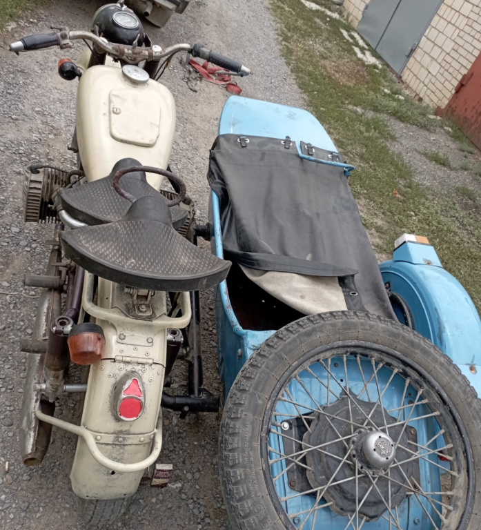 В общем привез домой этот металлолом. Записался через госуслуги на переоформление и начал собирать макет мотоцикла из кучи чермета для прохождения техосмотра и оформления в ГИБДД. На фото вы можете просмотреть что у меня получилось. Коляску взял у товарища с Урала. На мотоцикле есть поворотники, стоп сигнал, покрашен в соответствии с документами, в общем оформить удалось без проблем.