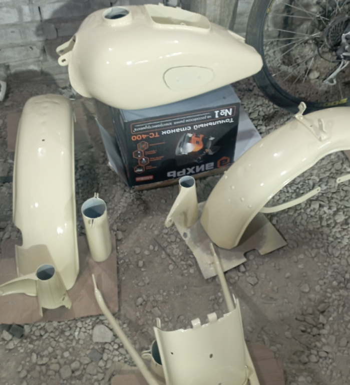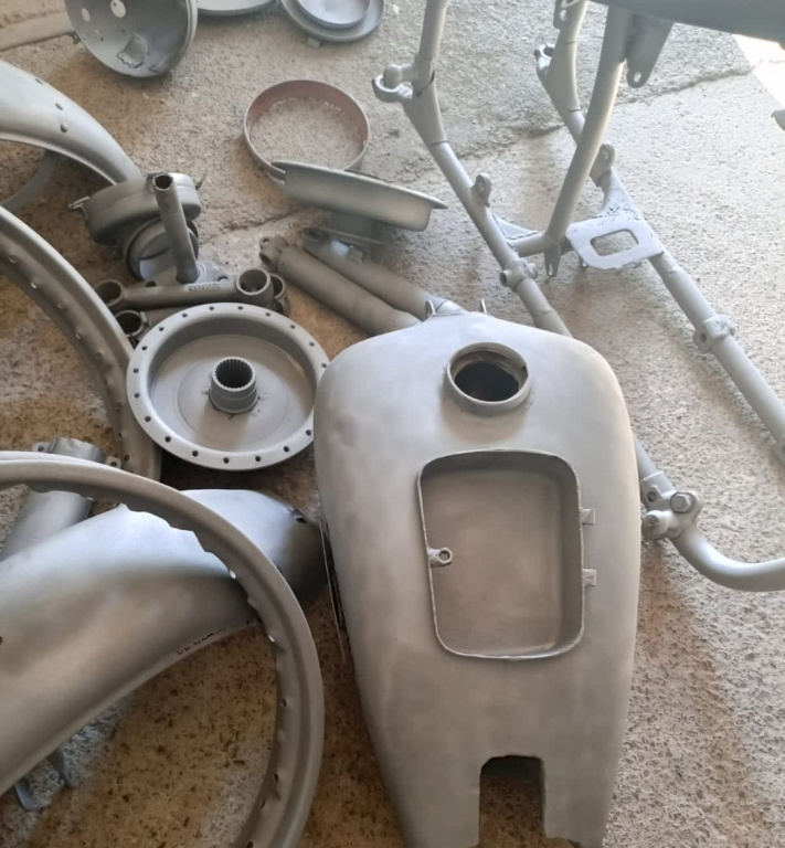 Время неумолимо течет, скоро я приеду домой и смогу снова заняться мотоциклом. А во время моего отсутствия дело не стояло в мертвой точке. Жена забрала детали с пескоструйки. У меня есть почти всё железо кроме верхних кожухов передней вилки.