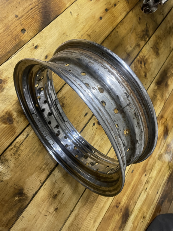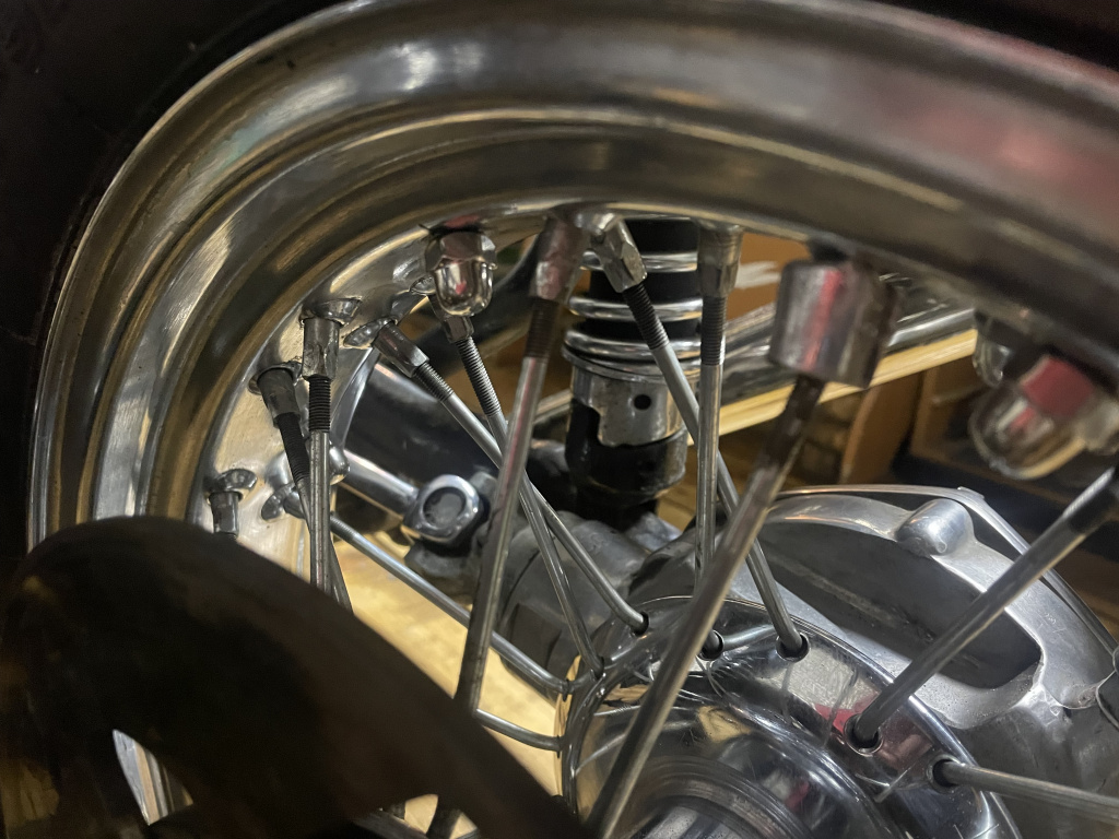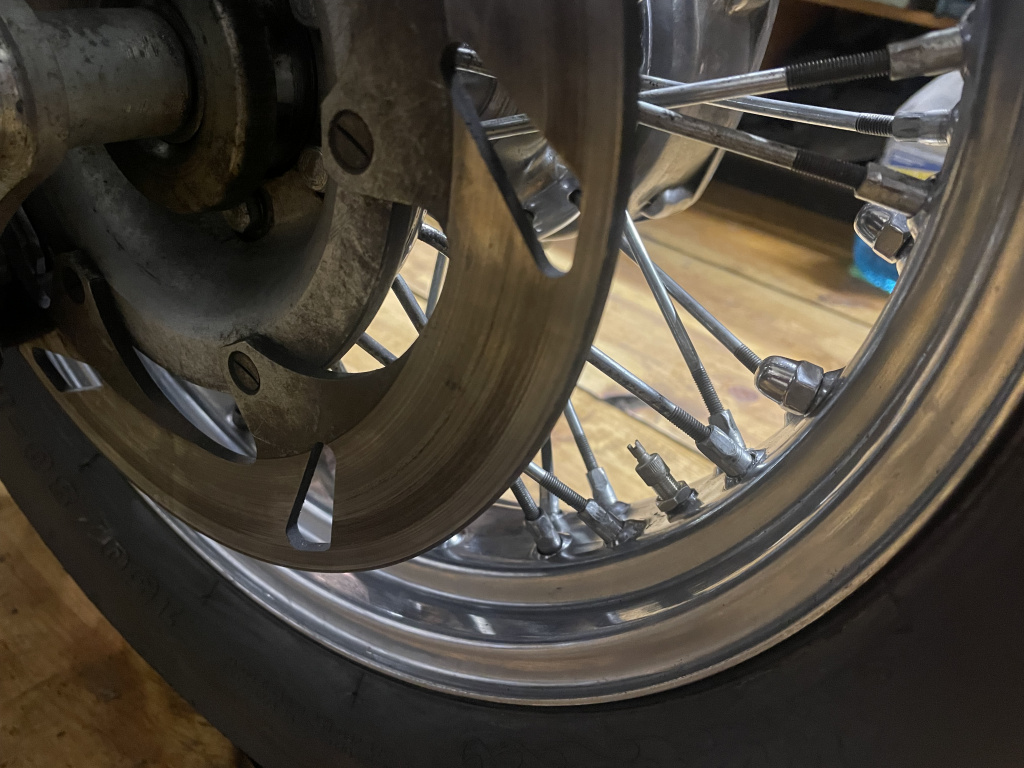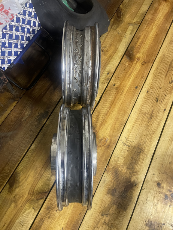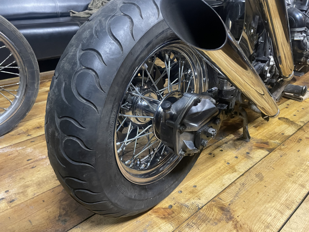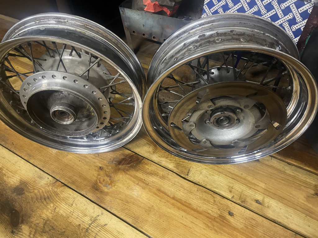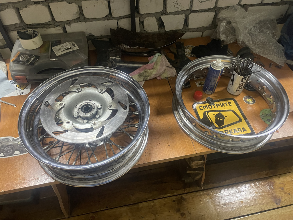 В определённый момент жизни пришлось научиться самому переспицовывать колёса, меняя ступицы и обода. В частности, на своём волке решил сзади сделать колесо 15" вместо шестнадцатидюймового, чтобы гармоничнее смотрелось с передним восемнадцатидюймовым, и влазила резина пошире. Приобрёл по случаю самопальный хромированный обод, явно сделанный из разварки штампованного автодиска. Щирина посадочного места у него была 4,5", как я потом узнал, как у Yamaha DragStar. Т.е. обод был под резину шириной 170мм, поэтому поставленный мной баллон шириной 150мм растащило по бокам до 160мм, и он встал домиком и слегка иногда задевал серединой правой боковины кардан. Плюс сам обод не имел пуклёвки, был достаточно массивным. Я решил поменять его на что-то более лёгкое. В размере пятнадцать дюймов под сорок спиц есть только колёса от некоторых Кавасаки Элиминатор, но обода у них очень узкие (меньше трёх дюймов шириной). Другая альтернатива - широкие обода от ДрагСтар под 48 спиц (отпадает), и обода от Honda Shadow под 52 спицы, шириной 3,5" (как у ободов волков и вояжей, лучшее из возможного). К слову, харлейские шестнадцатые обода всего три дюйма шириной, как правило. По случаю было приобретено колесо от шадовы, у которого обод был в прекрасном состоянии. Волковская ступица на сорок спиц была вкрячена в обод шадовы. Спицы встали вкривь и вкось, без чёткого рисунка плетения, в оставшиеся дырки вставлены винты, на которые с резьбовым герметиком накручены колпачковые гайки. Радиальное (яйцо) и осевое (восьмёрка) биения выправлены спицами в показатели до 1,2мм , грузиков навешано 60гр при статической балансировке. Стоявшее колесо 15" с колесом от шадовы Разборка Собранное колесо с ободом от хонды. Справа видно полоску посередине боковины - раньше резина кардан задевала малость. |